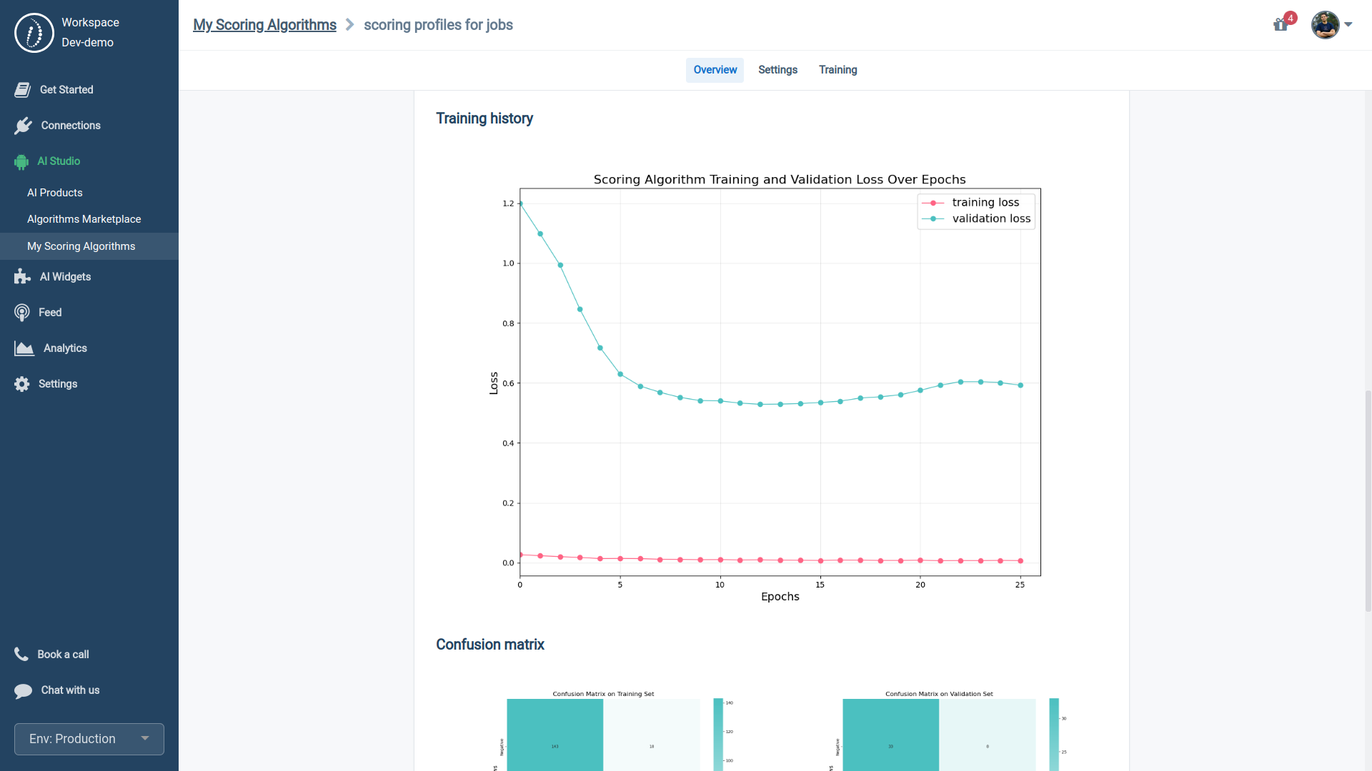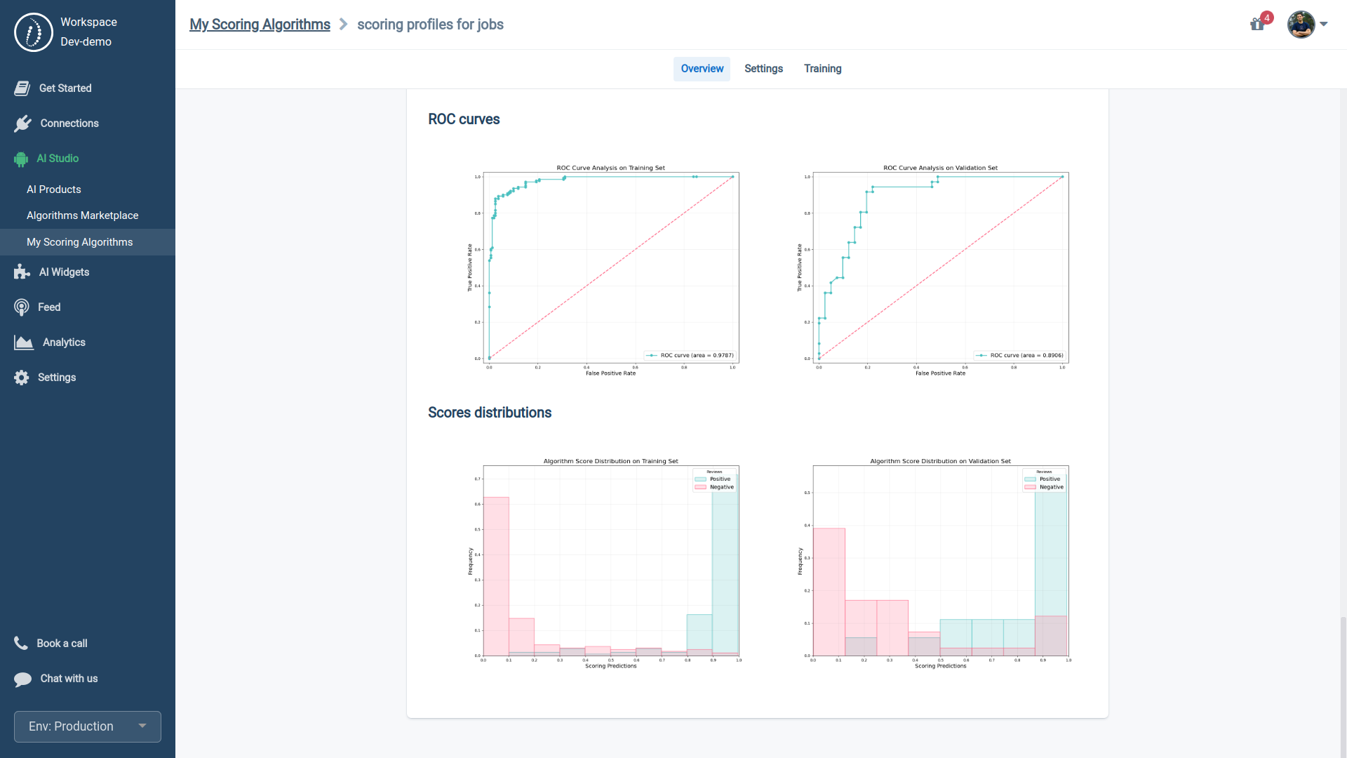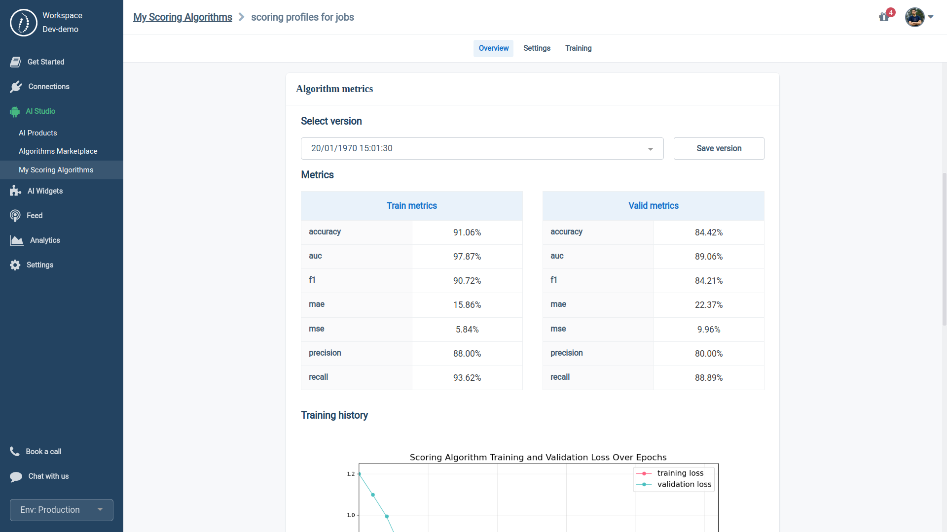 In this section, you can easily switch between the different trained versions of your Algorithm and make informed decisions based on both: