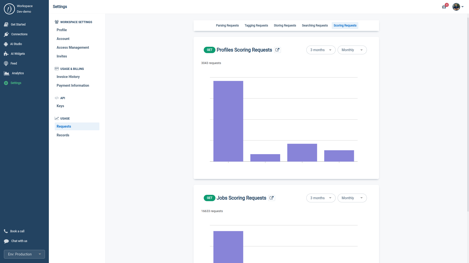- Searching and Scoring APIs are billed based only on the number of active stored profiles or jobs, regardless of the number of query requests made