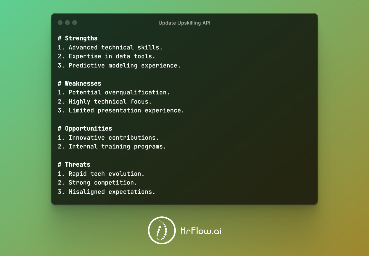 The Job Upskilling API is an explainable AI (XAI) solution that generates a SWOT matrix for candidates. This matrix helps candidates understand jobs recommendations by analyzing the skills gap between their profile and the job, alongside labor market best practices.