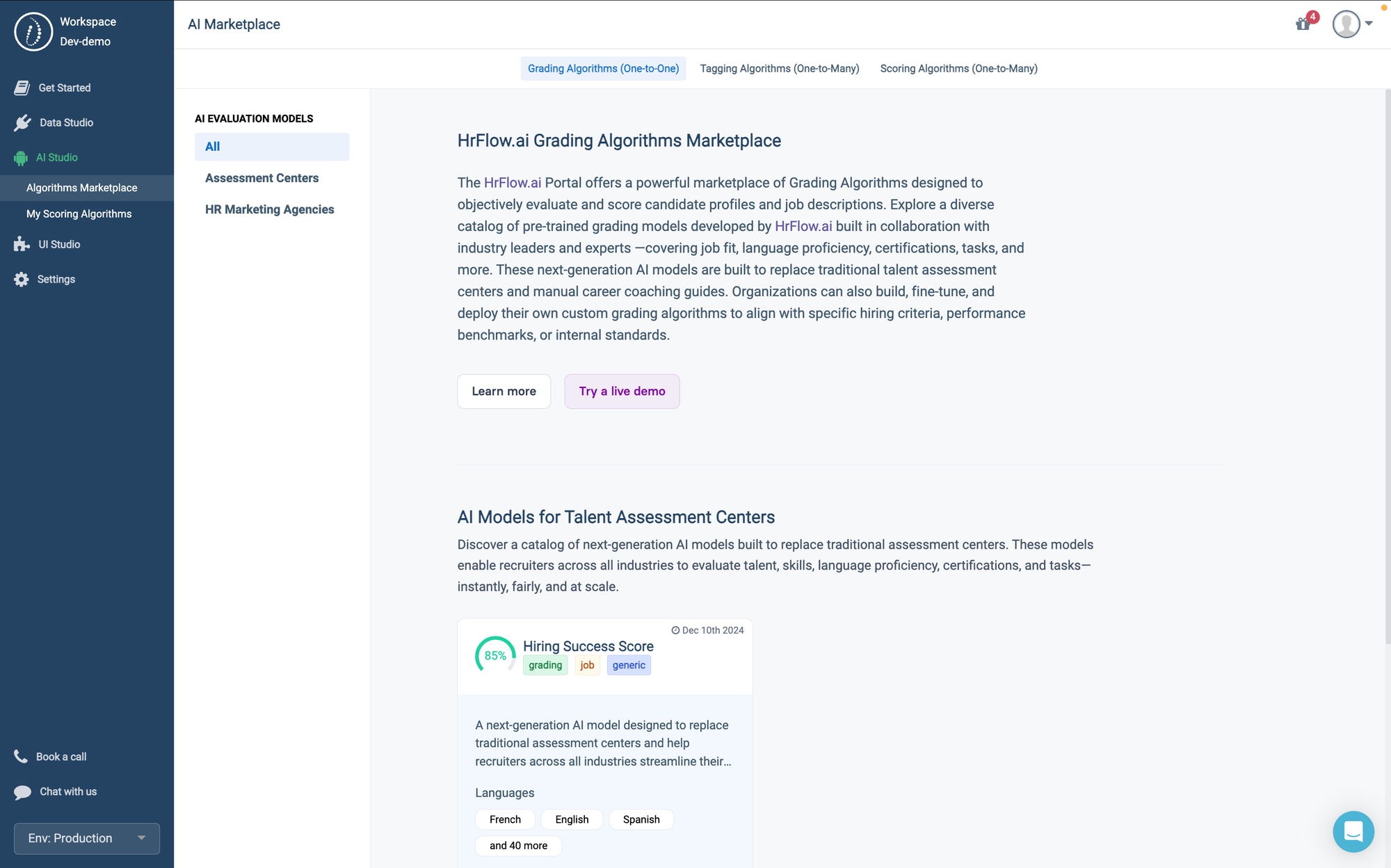 We’re excited to introduce the Grading Algorithms Marketplace in the HrFlow.ai Portal — a dedicated space where you can discover and deploy pre‑trained grading models, developed by HrFlow.ai in collaboration with industry leaders and domain experts.