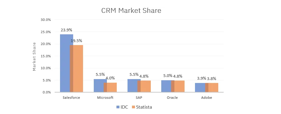 - Salesforce: Salesforce commands the worldwide CRM market, boasting a commanding market share of 23.9%, surpassing the collective share of its four closest competitors. More than 60% of the company's revenue comes from existing customers, and the organization is making steady headway in reducing attrition rates.