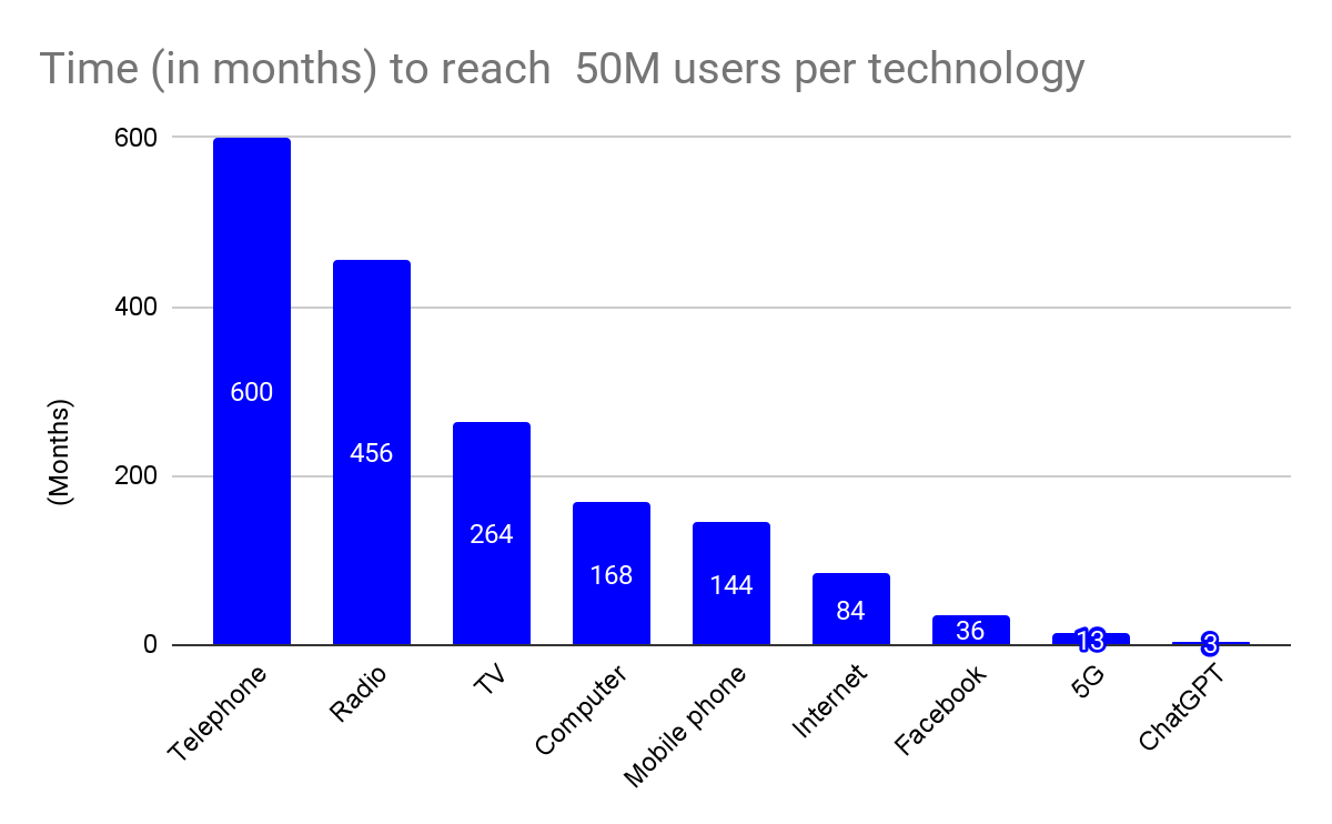 AI usage continues to rise, both globally and within the recruitment industry. Adoption of new technologies is accelerating at an unprecedented pace. The following infographic illustrates the time (in years) it took each major technology to reach 50 million users (Sources: Statista, McKinsey, VisualCapitalist, Ericsson, Reuters).